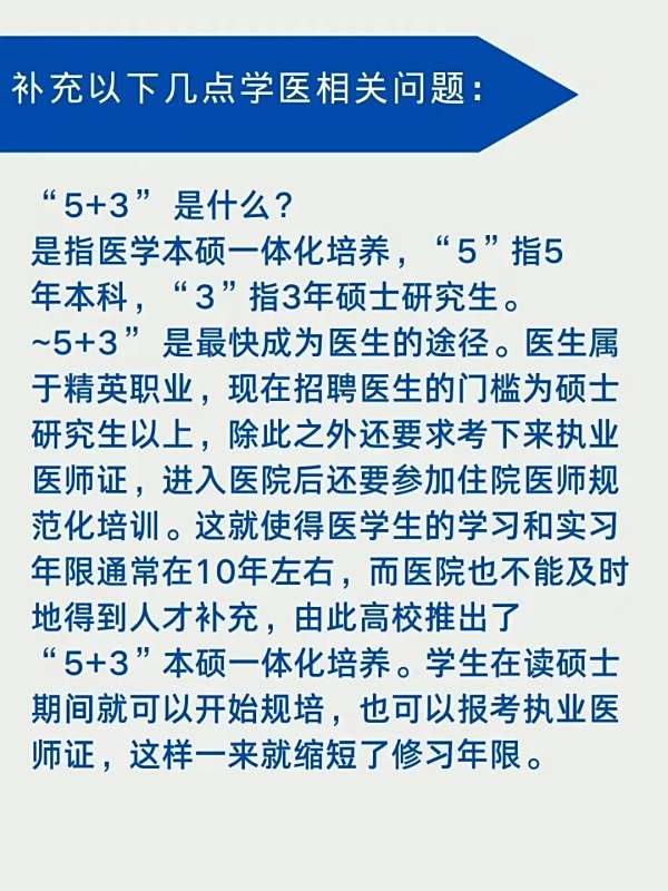 是指医学本硕一体化培养,“5”指5年本科,“3”指3年硕士研究生。~5+3”是最快成为医生的途径。医生属于精英职业,现在招聘医生的门槛为硕士研究生以上,除此之外还要求考下来执业医师证,进入医院后还要参加住院医师规范化培训。这就使得医学生的学习和实习年限通常在10年左右,而医院也不能及时地得到人才补充,由此高校推出了“5+3”本硕一体化培养。学生在读硕士期间就可以开始规培,也可以报考执业医师证,这样一来就缩短了修习年限。