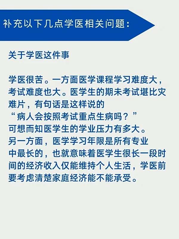 学医很苦。一方面医学课程学习难度大,考试难度也大。医学生的期未考试堪比灾难片,有句话是这样说的“病人会按照考试重点生病吗?"可想而知医学生的学业压力有多大。另一方面,医学学习年限是所有专业中最长的,也就意味着医学生很长一段时间的经济收入仅能维持个人生活,学医前要考虑清楚家庭经济能不能承受。