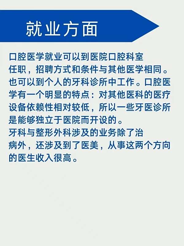 口腔医学就业可以到医院口腔科室任职,招聘方式和条件与其他医学相同。也可以到个人的牙科诊所中工作。口腔医学有一个明显的特点:对其他医科的医疗设备依赖性相对较低,所以一些牙医诊所是能够独立于医院而开设的。牙科与整形外科涉及的业务除了治病外,还涉及到了医美,从事这两个方向的医生收入很高。
