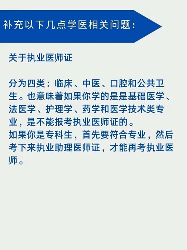 分为四类:临床、中医、口腔和公共卫生。也意味着如果你学的是是基础医学、法医学、护理学、药学和医学技术类专业,是不能报考执业医师证的。如果你是专科生,首先要符合专业,然后考下来执业助理医师证,才能再考执业医师。