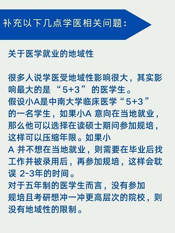 很多人说学医受地域性影响很大,其实影响最大的是“5+3”的医学生。假设小A是中南大学临床医学“5+3”的一名学生,如果小A意向在当地就业,那么他可以选择在读硕士期问参加规培,这样可以压缩年限。如果小A 并不想在当地就业,则需要在毕业后找工作并被录用后,再参加规培,这样会耽误 2-3年的时间。对于五年制的医学生而言,没有参加规培且考研想冲一冲更高层次的院校,则没有地域性的限制。