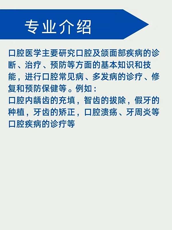 口腔医学主要研究口腔及颌面部疾病的诊断、治疗、预防等方面的基本知识和技能,进行口腔常见病、多发病的诊疗、修复和预防保健等。例如:口腔内龋齿的充填,智齿的拔除,假牙的种植,牙齿的矫正,口腔溃疡、牙周炎等口腔疾病的诊疗等。