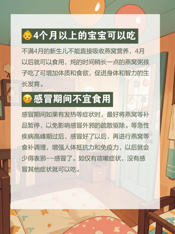 不满4月的新生儿不能直接吸收燕窝营养,4月以后就可以食用,炖的时间稍长一点的燕窝粥孩子吃了可增加体质和食欲,促进身体和智力的生长发育。