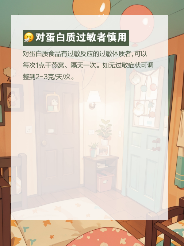 对蛋白质食品有过敏反应的过敏体质者, 可以每次1克干燕窝、隔天一次。如无过敏症状可调整到2-3克/天/次。