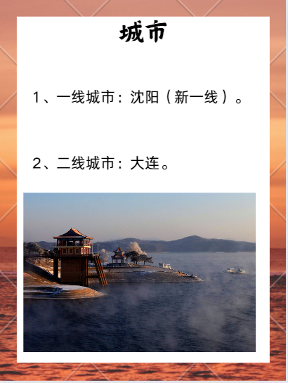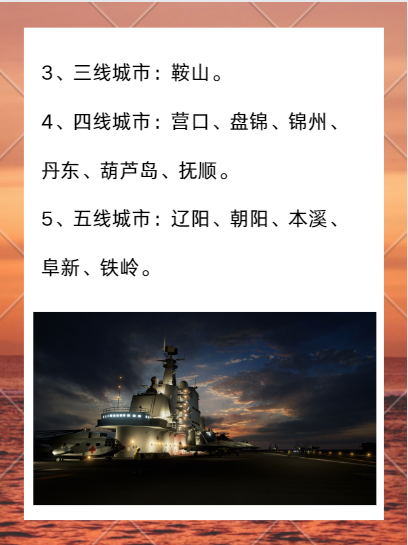 4、四线城市:营口、盘锦、锦州、丹东、葫芦岛、抚顺。