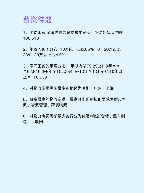 1、平均年薪:全国物流专员岗位的薪资,平均每年大约在100,613。