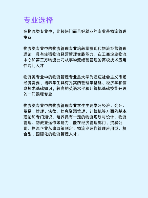 物流类专业中的物流管理专业是大学为适应社会主义市场经济需要,培养学生具有扎实的管理学基础、经济学和信息技术基础知识,较高的英语水平和计算机基础技能开设的一门课程专业。