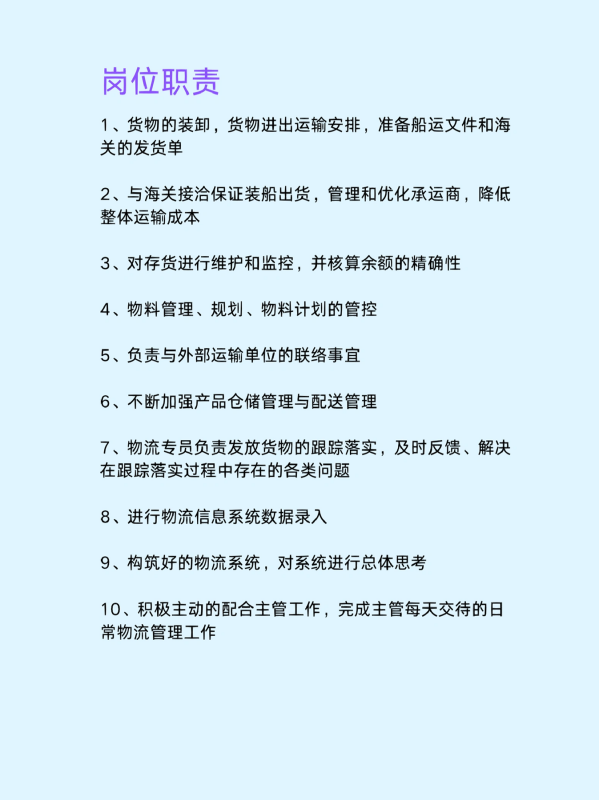 10、积极主动的配合主管工作,完成主管每天交待的日常物流管理工作。