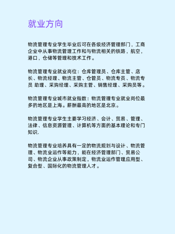 物流管理专业学生毕业后可在各级经济管理部门,工商企业中从事物流管理工作和与物流相关的铁路,航空港口,仓储等管理和技术工作。
