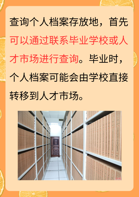 要查询个人档案存放地,可以联系毕业学校或人才市场,或者到所在单位的人事或人力资源部门咨询。如果需要更详细的查询,可以前往当地的劳动保障局或人力资源和社会保障局,以及公安部门或户籍管理部门进行查询。