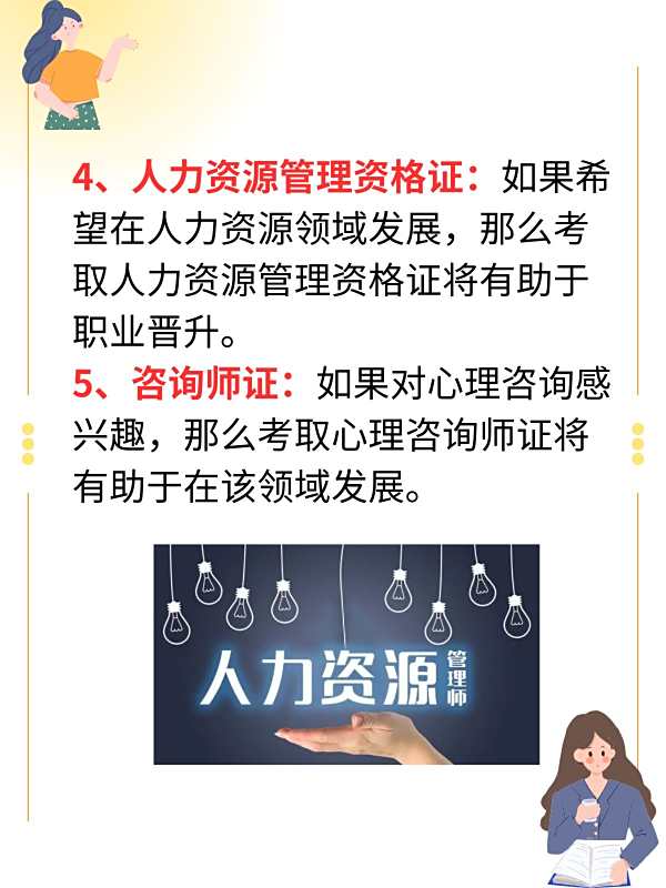 4、人力资源管理资格证:如果希望在人力资源领域发展,那么考取人力资源管理资格证将有助于职业晋升。
