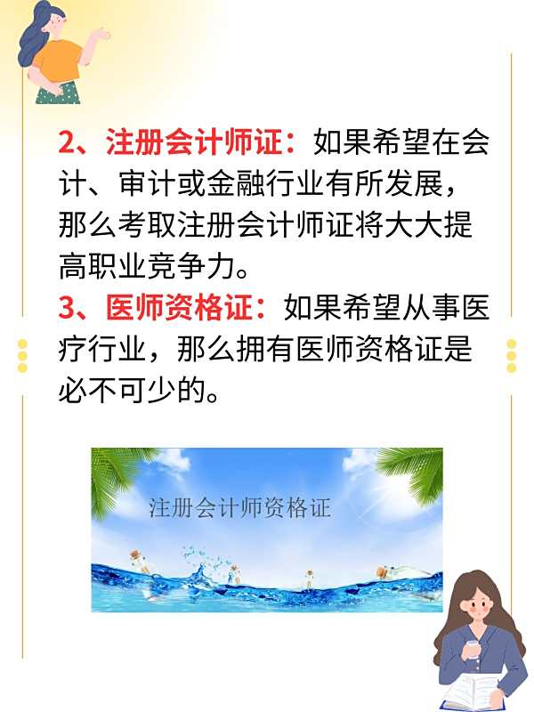 3、医师资格证:如果希望从事医疗行业,那么拥有医师资格证是必不可少的。
