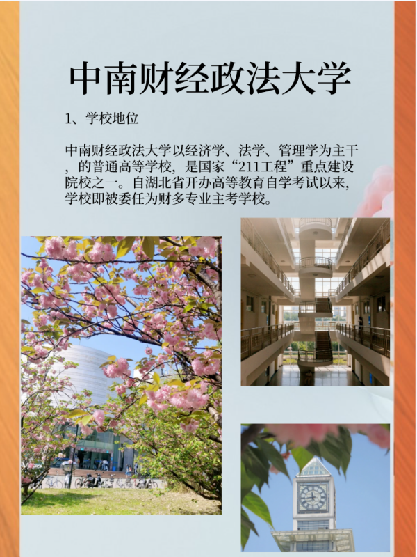 中南财经政法大学以经济学、法学、管理学为主干,的普通高等学校,是国家“211工程”重点建设院校之一。自湖北省开办高等教育自学考试以来,学校即被委任为财多专业主考学校。