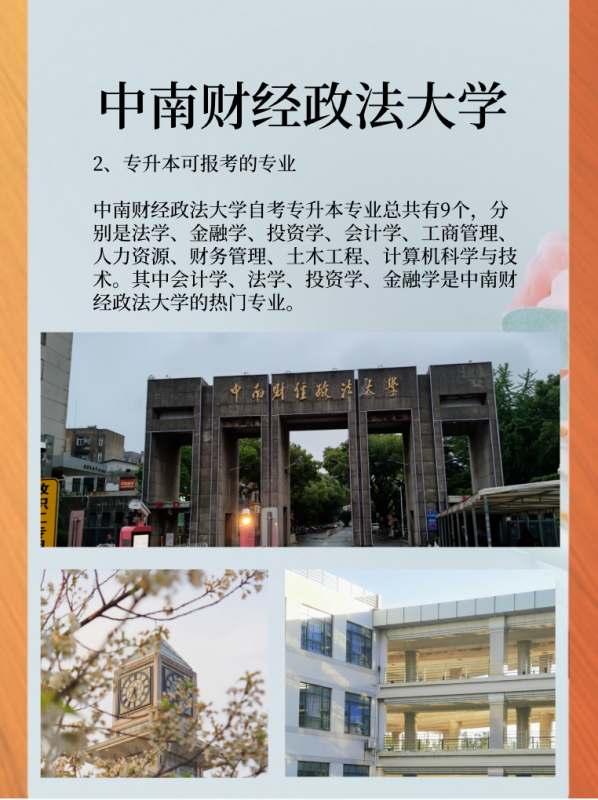 中南财经政法大学自考专升本专业总共有9个,分别是法学、金融学、投资学、会计学、工商管理、人力资源、财务管理、土木工程、计算机科学与技术。其中会计学、法学、投资学、金融学是中南财经政法大学的热门专业。