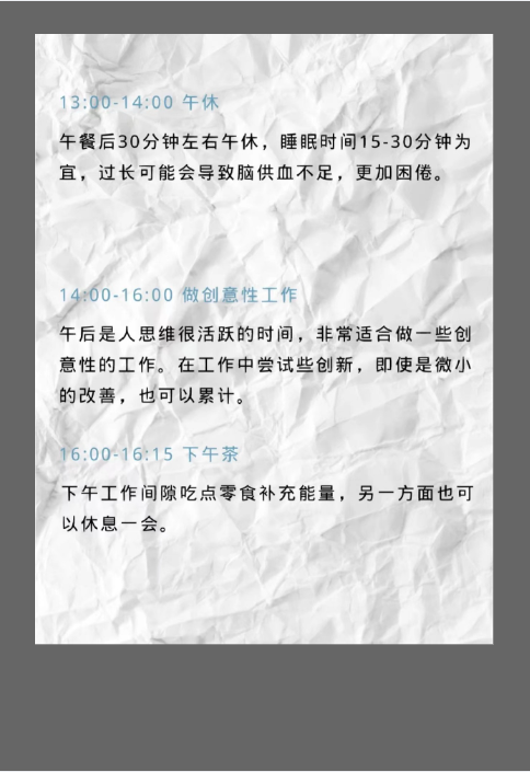 午后是人思维很活跃的时间,非常适合做一些创意性的工作。在工作中尝试些创新,即使是微小的改善,也可以累计。