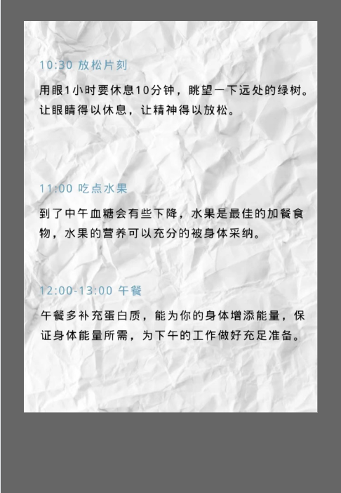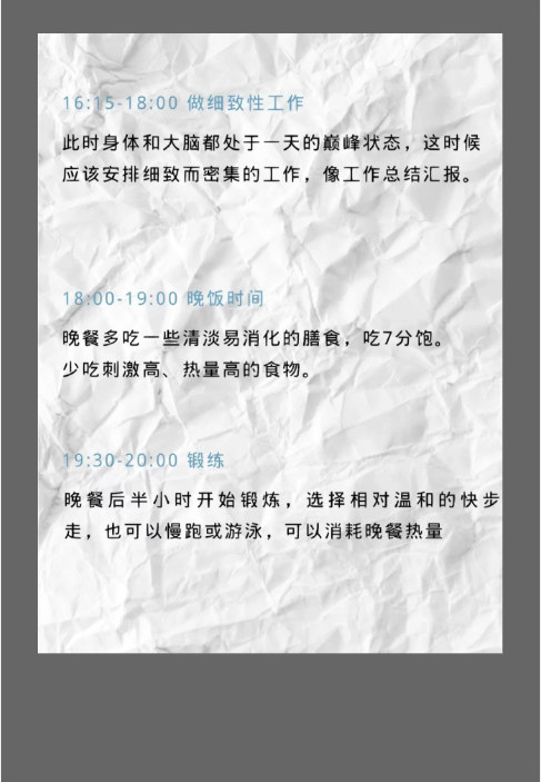 此时身体和大脑都处于一天的巅峰状态,这时候应该安排细致而密集的工作,像工作总结汇报。