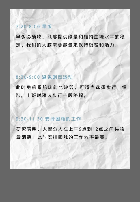 此时免疫系统功能比较弱,可适当选择步行、慢跑。上班时建议步行一段路程。9:30-11:30安排困难的工作研究表明,大部分人在上午9点到12点之间头脑最清醒,此时安排困难的工作效率最高。