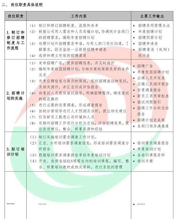 详细的岗位职责描述:详细列出该岗位的各项职责,如“制定并执行招聘计划,确保公司招聘到合适的人才”、“组织并开展员工培训,提高员工的专业技能和综合素质”等。