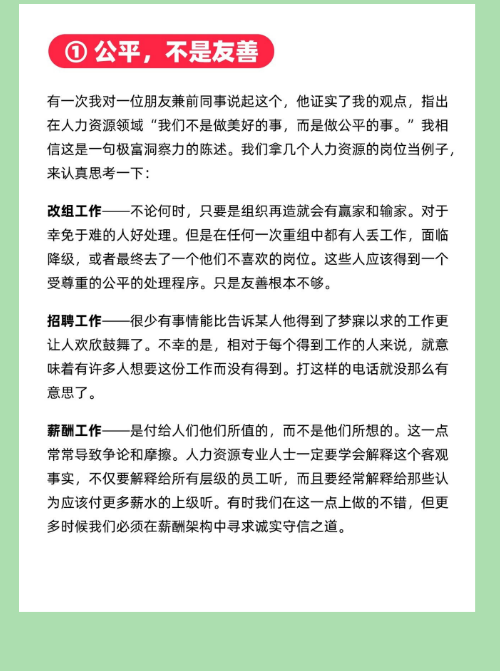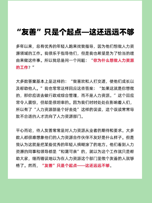 但是我认为这就是把某些优秀的年轻人搞糊涂了的地方,他们看到人力资源的同事和领导都是“和蔼可亲”的,就以为这个工作就只是帮助大家,继而错误地以为在人力资源这个部门里做个友善的人就够格了。然而,"友善”只是个起点,这还远远不够。
