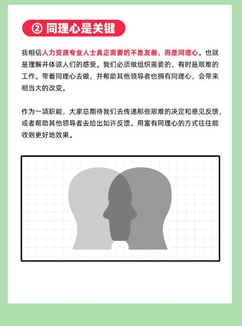 我相信人力资源专业人士真正需要的不是友善而是同理心,也就是理解并体谅人们的感受。我们必须做组织需要的,有时是艰难的工作。带着同理心去做,并帮助其他领导者,也拥有同理心,会带来相当大的改变。