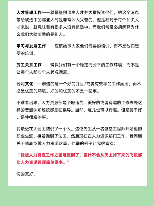我最近在大会上结识了一个人,这位先生从一名航空工程师开始他的职业生涯,接着搬到了法国,然后现在在人力资源部门工作。我问到关于他转型做人力资源这事,他举的例子让我很喜欢:“我被人力资源工作之困难惊到了,设计不会从天上掉下来的飞机,都比人力资源管理简单得多。"