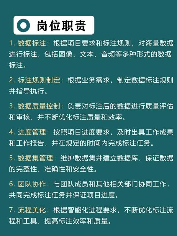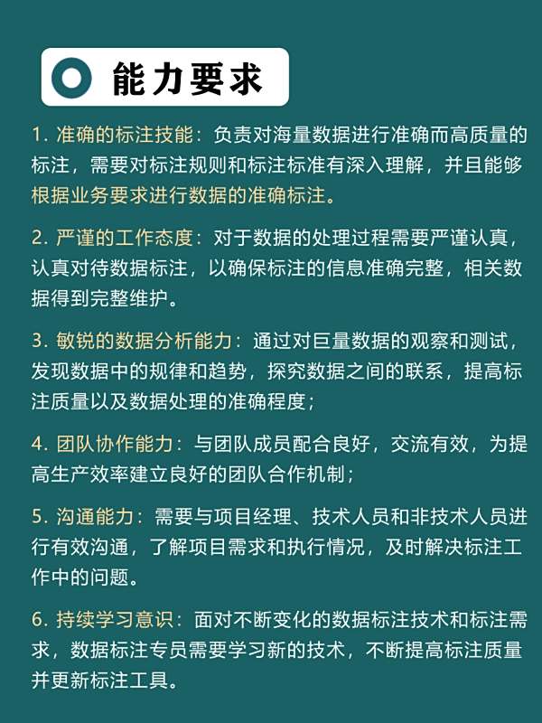 1.准确的标注技能:负责对海量数据进行准确而高质量的标注,需要对标注规则和标注标准有深入理解,并且能够根据业务要求进行数据的准确标注。