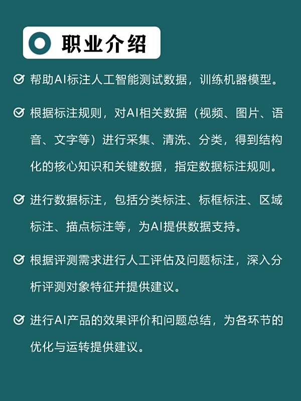 帮助Al标注人工智能测试数据,训练机器模型。根据标注规则,对Al相关数据(视频、图片、语音、文字等)进行采集、清洗、分类,得到结构化的核心知识和关键数据,指定数据标注规则。进行数据标注,包括分类标注、标框标注、区域标注、描点标注等,为Al提供数据支持。根据评测需求进行人工评估及问题标注,深入分析评测对象特征并提供建议。进行AI产品的效果评价和问题总结,为各环节的优化与运转提供建议。