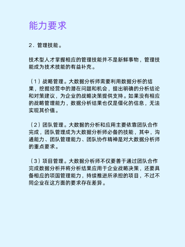 (1)战略管理。大数据分析师需要利用数据分析的结果,挖掘经营中的潜在问题和机会,提出明确的分析结论和对策建议,为企业的战略决策提供支持。如果没有相应的战略管理能力,数据分析结果也仅是僵化的信息,无法实现其价值。