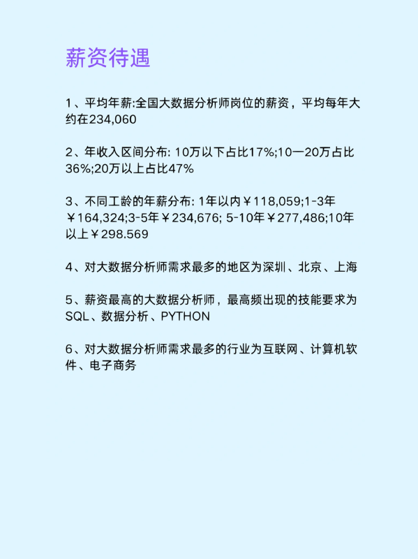 1、平均年薪:全国大数据分析师岗位的薪资,平均每年大约在234,060。