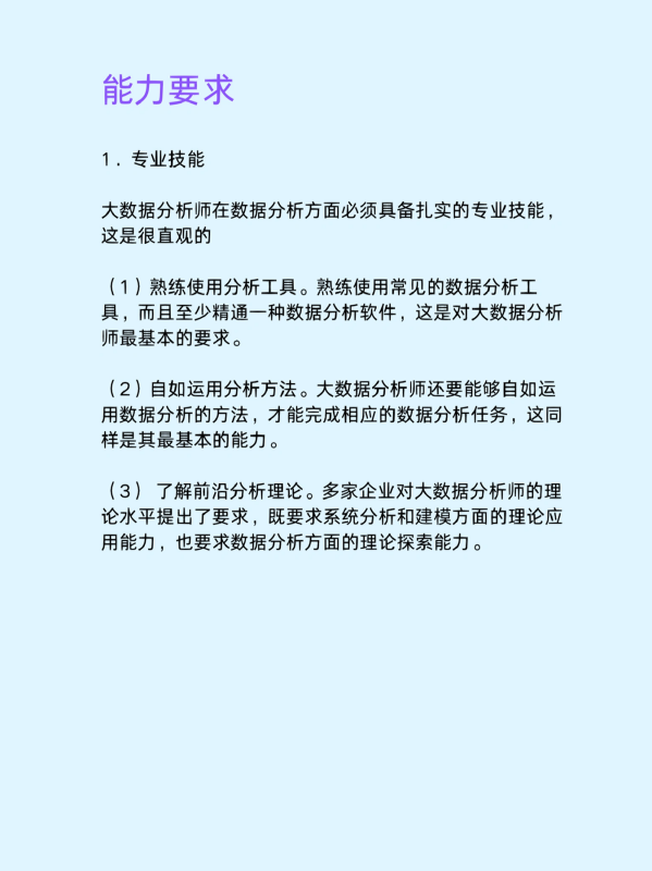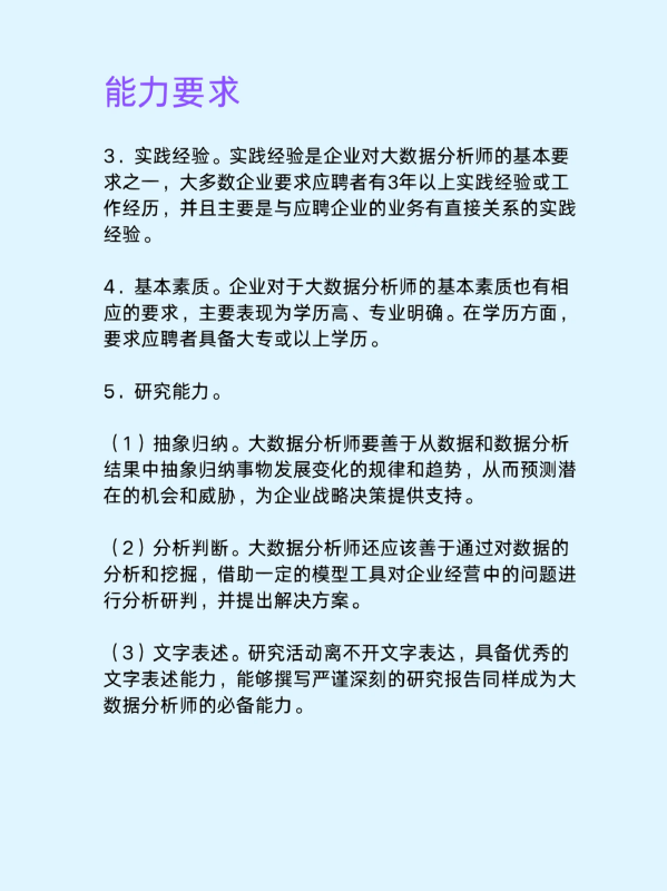 4.基本素质。企业对于大数据分析师的基本素质也有相应的要求,主要表现为学历高、专业明确。在学历方面要求应聘者具备大专或以上学历。