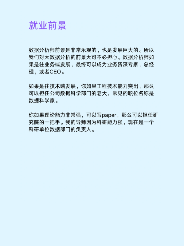 如果是往技术端发展,你如果工程技术能力突出,那么可以担任公司数据科学部门的老大,常见的职位名称是数据科学家。
