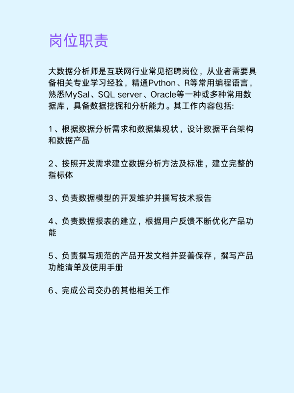 大数据分析师是互联网行业常见招聘岗位,从业者需要具备相关专业学习经验,精通Pvthon、R等常用编程语言熟悉MySal、SQL server、Oracle等一种或多种常用数据库,具备数据挖掘和分析能力。其工作内容包括: