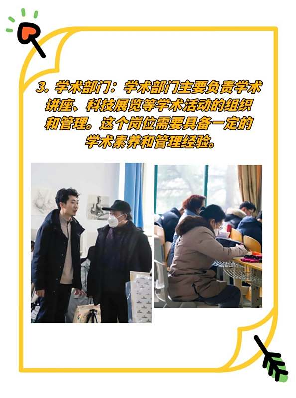 3. 学术部门:学术部门主要负责学术讲座、科技展览等学术活动的组织和管理。这个岗位需要具备一定的学术素养和管理经验。在这个部门工作,能够接触到各个专业的大牛、了解学术前沿的动态,在组织学术活动时也能够锻炼自己的团队协作和组织能力。