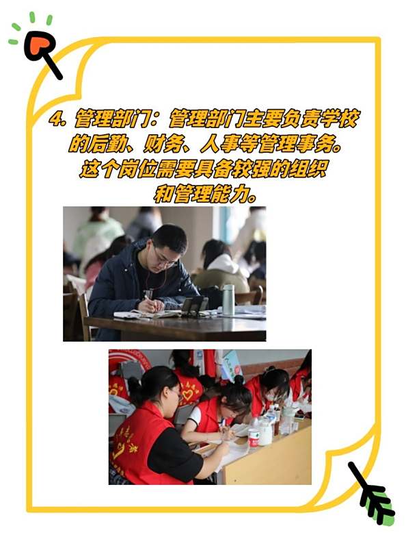 4. 管理部门:管理部门主要负责学校的后勤、财务、人事等管理事务。这个岗位需要具备较强的组织和管理能力。在这个部门工作,能够深入了解学校的管理体系、协助解决各部门的管理问题,在管理事务上也能够锻炼自己的领导能力。