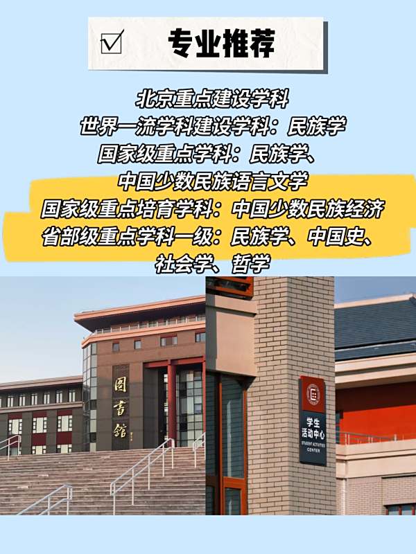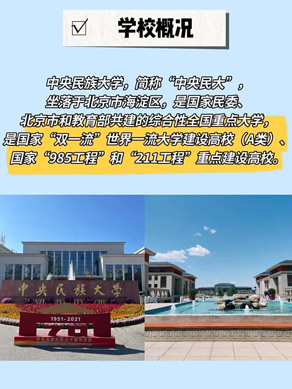 中央民族大学,简称“中央民大”,坐落于北京市海淀区,是国家民委、北京市和教育部共建的综合性全国重点大学,是国家“双一流”世界一流大学建设高校(A类)、国家“985工程”和“211工程”重点建设高校。