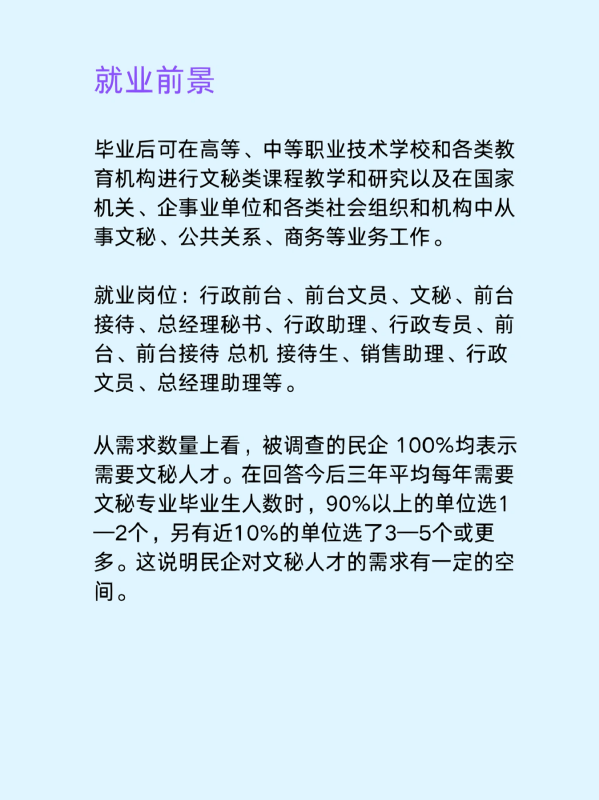 就业岗位: 行政前台、前台文员、文秘、前台接待、总经理秘书、行政助理、行政专员、前台、前台接待 总机 接待生、销售助理、行政文员、总经理助理等。