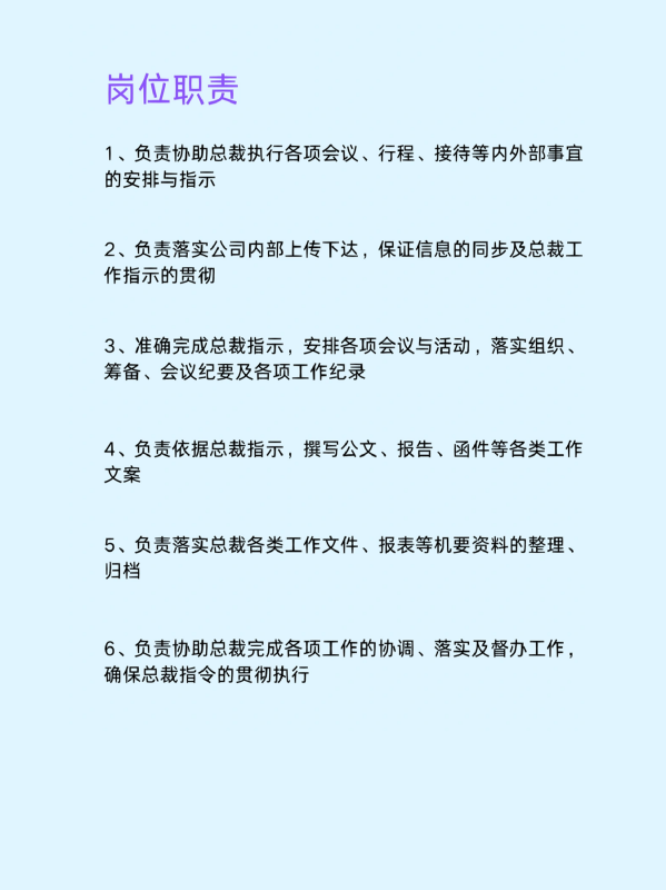 3、准确完成总裁指示,安排各项会议与活动,落实组织筹备、会议纪要及各项工作纪录。