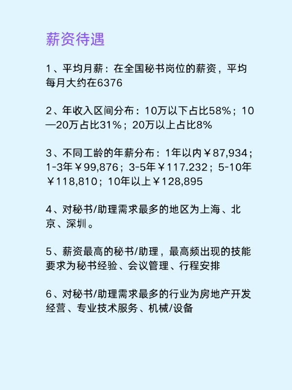 1、平均月薪: 在全国秘书岗位的薪资,平均每月大约在6376。