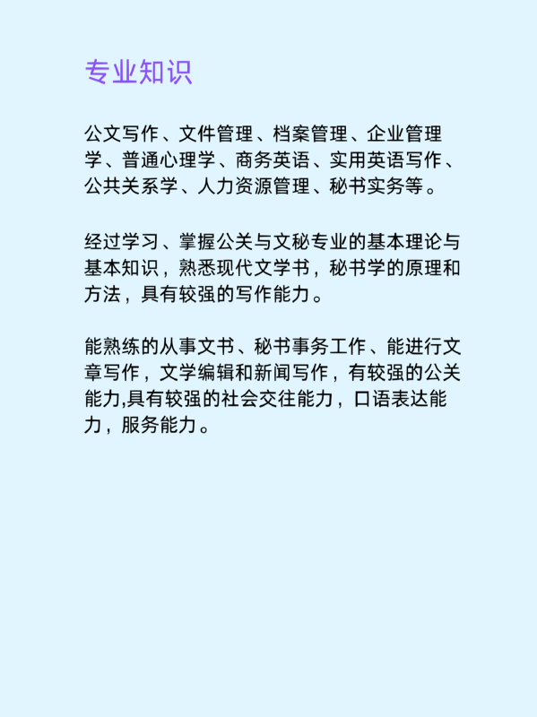 能熟练的从事文书、秘书事务工作、能进行文章写作,文学编辑和新闻写作,有较强的公关能力,具有较强的社会交往能力,口语表达能力,服务能力。
