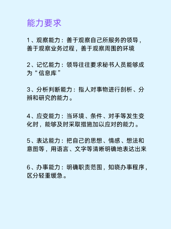 1、观察能力:善于观察自己所服务的领导善于观察业务过程,善于观察周围的环境。