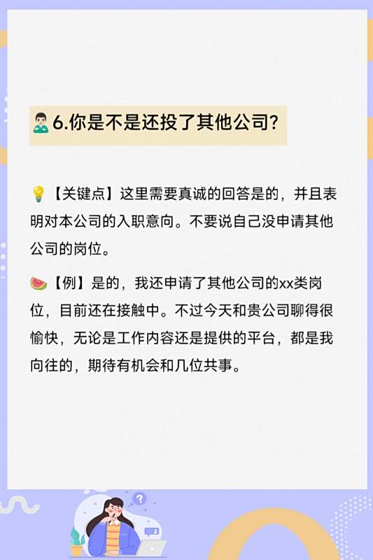 【关键点】这里需要真诚的回答是的,并且表明对本公司的入职意向。不要说自己没申请其他公司的岗位。【例】是的,我还申请了其他公司的xx类岗位,目前还在接触中。不过今天和贵公司聊得很愉快,无论是工作内容还是提供的平台,都是我向往的,期待有机会和几位共事。