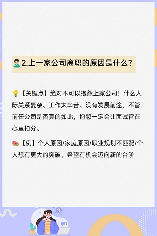 【关键点】绝对不可以抱怨上家公司!什么人际关系复杂、工作太辛苦、没有发展前途,不管前任公司是否真的如此,抱怨一定会让面试官在心里扣分。【例】个人原因/家庭原因/职业规划不匹配/个人想有更大的突破,希望有机会迈向新的台阶。