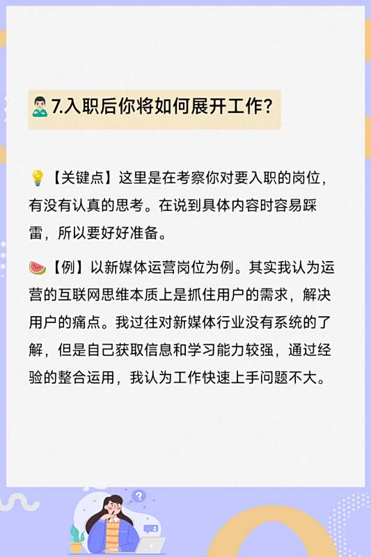 【关键点】这里是在考察你对要入职的岗位,有没有认真的思考。在说到具体内容时容易踩雷,所以要好好准备。【例】以新媒体运营岗位为例。其实我认为运营的互联网思维本质上是抓住用户的需求,解决用户的痛点。我过往对新媒体行业没有系统的了解,但是自己获取信息和学习能力较强,通过经验的整合运用,我认为工作快速上手问题不大。