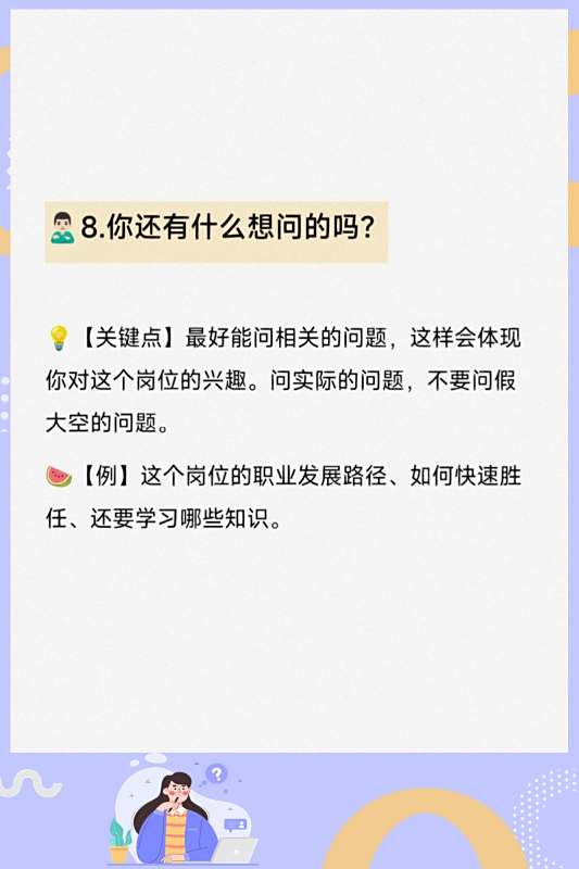 【关键点】最好能问相关的问题,这样会体现了对这个岗位的兴趣。问实际的问题,不要问假大空的问题。【例】这个岗位的职业发展路径、如何快速胜任、还要学习哪些知识。