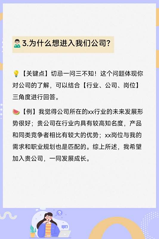 【关键点】切忌一问三不知!这个问题体现你对公司的了解,可以结合【行业、公司、岗位】三角度进行回答。【例】我觉得公司所在的xx行业的未来发展形势很好;贵公司在行业内具有较高知名度,产品和同类竞争者相比有较大的优势;xx岗位与我的需求和职业规划也是匹配的。综上所述,我希望加入贵公司,一同发展成长。