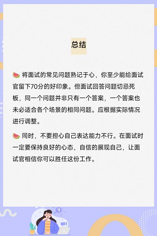 将面试的常见问题熟记于心,你至少能给面试官留下70分的好印象。但面试回答问题切忌死板,同一个问题并非只有一个答案,一个答案也未必适合各个场景的相同问题。应根据实际情况进行调整。同时,不要担心自己表达能力不行。在面试时一定要保持良好的心态,自信的展现自己,让面试官相信你可以胜任这份工作。