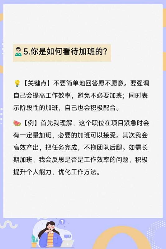 【关键点】不要简单地回答愿不愿意。要强调自己会提高工作效率,避免不必要加班,同时表示阶段性的加班,自己也会积极配合。【例】首先我理解,这个职位在项目紧急时会有一定量加班,必要的加班可以接受。其次我会高效产出,把任务完成,不拖团队后腿。如需长期加班,我会反思是否是工作效率的问题,积极提升个人能力,优化工作方法。