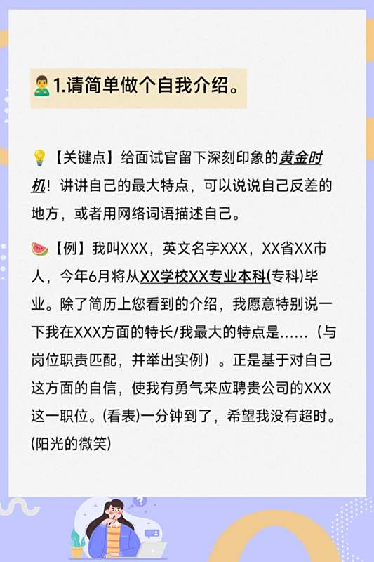 【关键点】给面试官留下深刻印象的黄金时机!讲讲自己的最大特点,可以说说自己反差的地方,或者用网络词语描述自己;【例】我叫XXX,英文名字XXX,XX省XX市人,今年6月将从XX学校XX专业本科(专科)毕业;除了简历上您看到的介绍,我愿意特别说一下我在XXX方面的特长/我最大的特点是….…(与岗位职责匹配,并举出实例);正是基于对自己这方面的自信,使我有勇气来应聘贵公司的XXX这一职位;(看表)一分钟到了,希望我没有超时(阳光的微笑)。