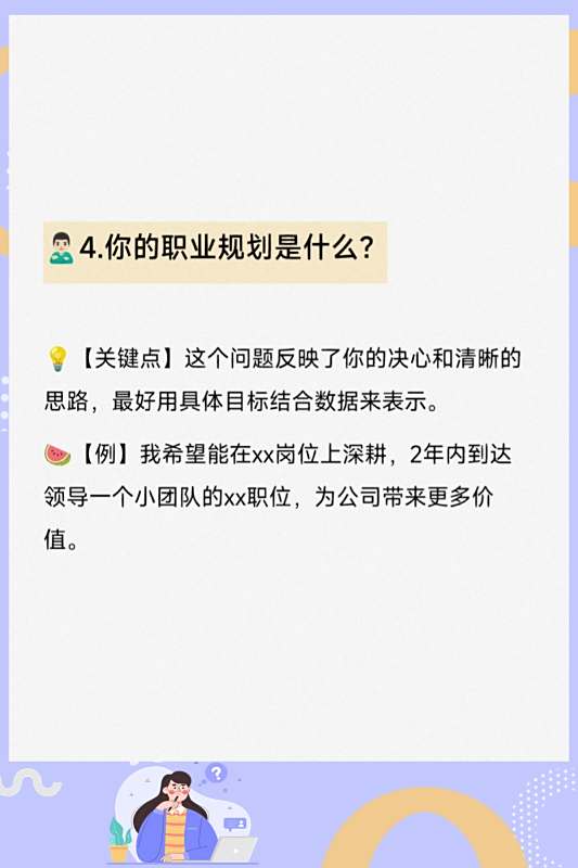 【关键点】这个问题反映了你的决心和清晰的思路,最好用具体目标结合数据来表示。【例】我希望能在xx岗位上深耕,2年内到达领导一个小团队的xx职位,为公司带来更多价值。