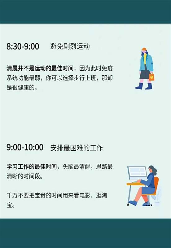 830-9:00避免剧烈运动清晨并不是运动的最佳时间,因为此时免疫系统功能最弱,你可以选择步行上班,那却是很健康的。